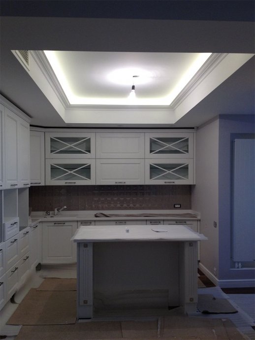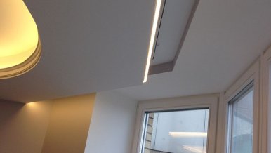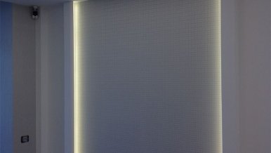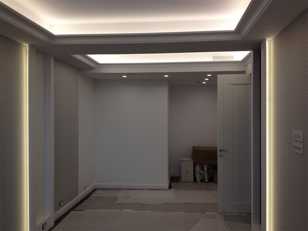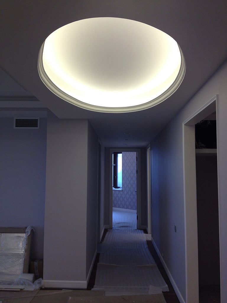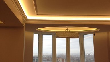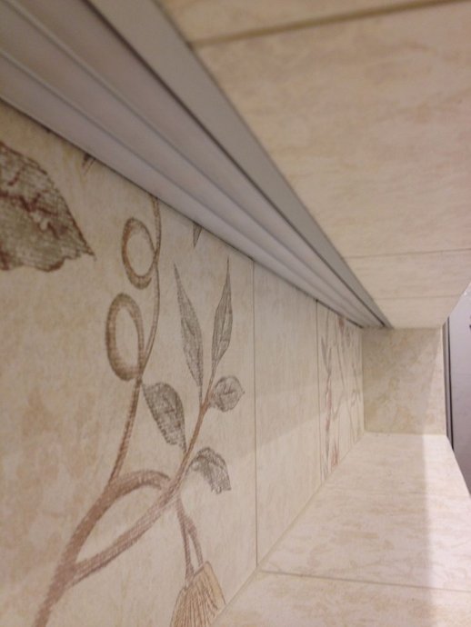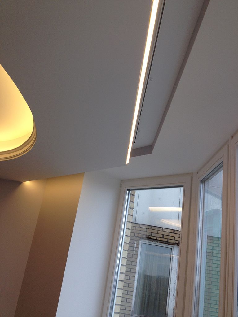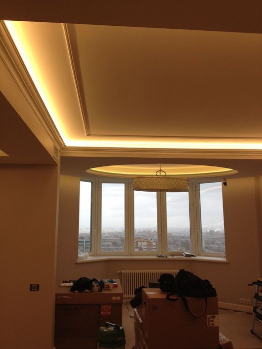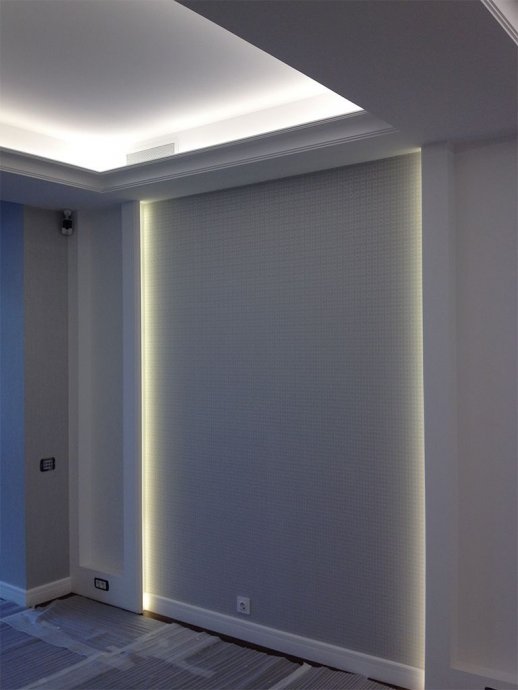 The main part of the LED strip mounted using aluminum profiles Arlight, which provided aesthetic design tape and additional heat dissipation, increasing its service life. From above, the profiles are covered with matte plastic screens that protect the tape from damage, as well as scattering light, which creates a beautiful effect of light lines.