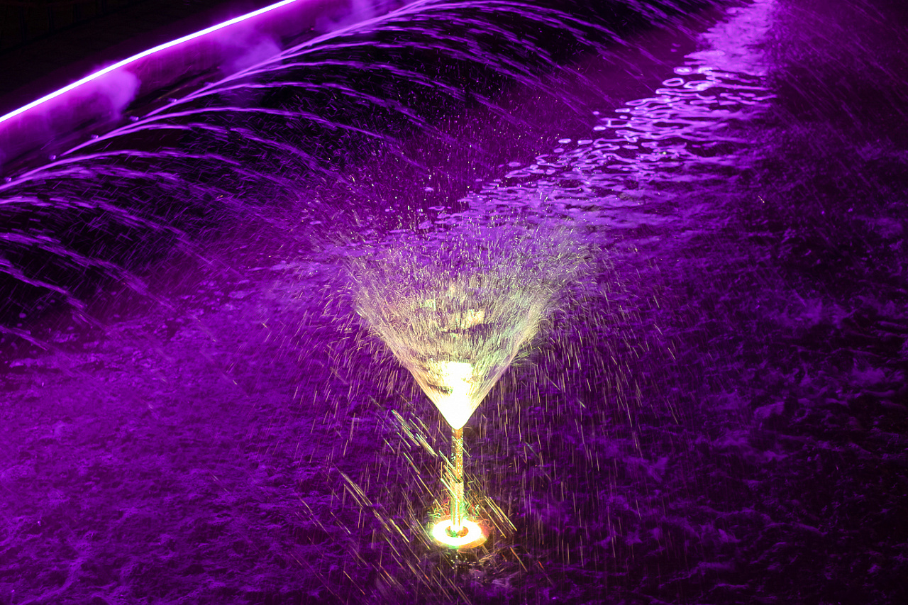Carefully considered waterproofing at the site: arranged dry pumps, LED strips with IP67 protection are used, as well as moisture-proof equipment to control backlighting.