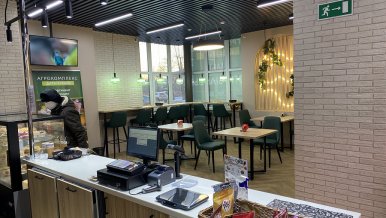The cafe area is additionally highlighted with a round pendant light fixture, which creates a chamber atmosphere. And linear luminaires in slatted ceilings emphasize the warm texture of the wood, adding to the coziness. Dimmers are used to control the backlighting, which can be used to adjust the brightness of the LED strip.