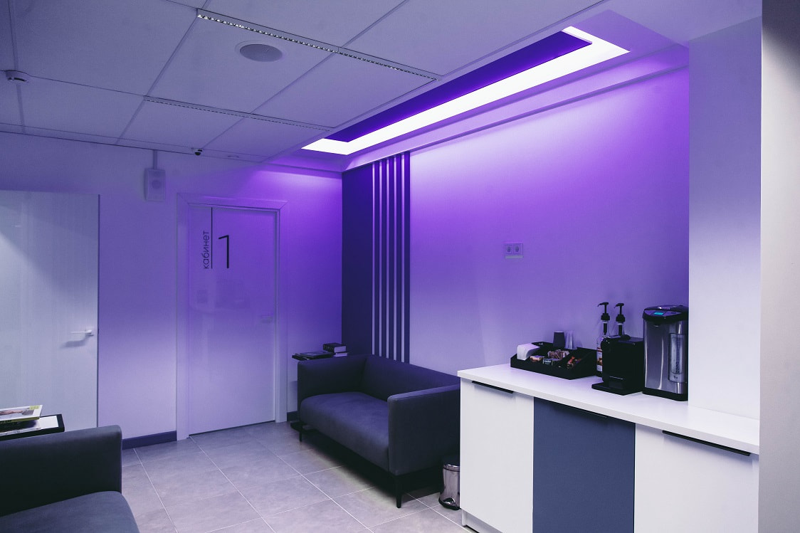 In the interiors of the clinic the corporate color is present very delicately - in the form of delicate lilac illumination of the lobby and waiting areas. RGBW tape of LUX series was used for backlighting. Due to mixing the color of light from 4 LEDs - white, red, green and blue - you can get any shades, including such pastel colors. In addition, the ribbon can shine pure white if required.