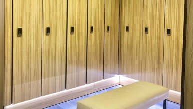 As the main lighting in the fitness club locker rooms, suspended luminaires made on the basis of aluminum profiles are used. Square and elongated rectangular luminaires illuminate the areas in front of the lockers according to their location. The light source is a cold-colored LED strip.