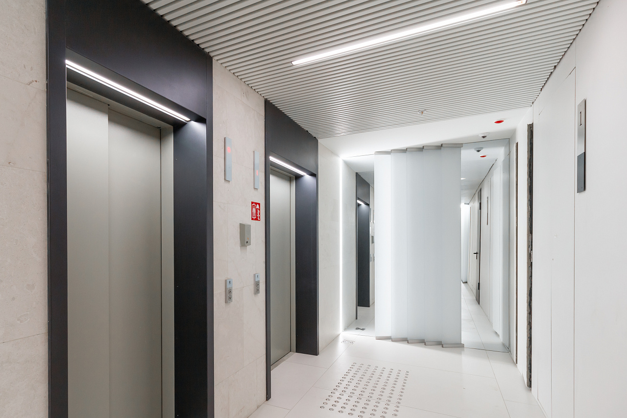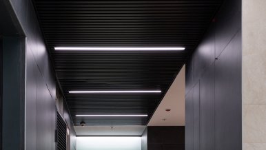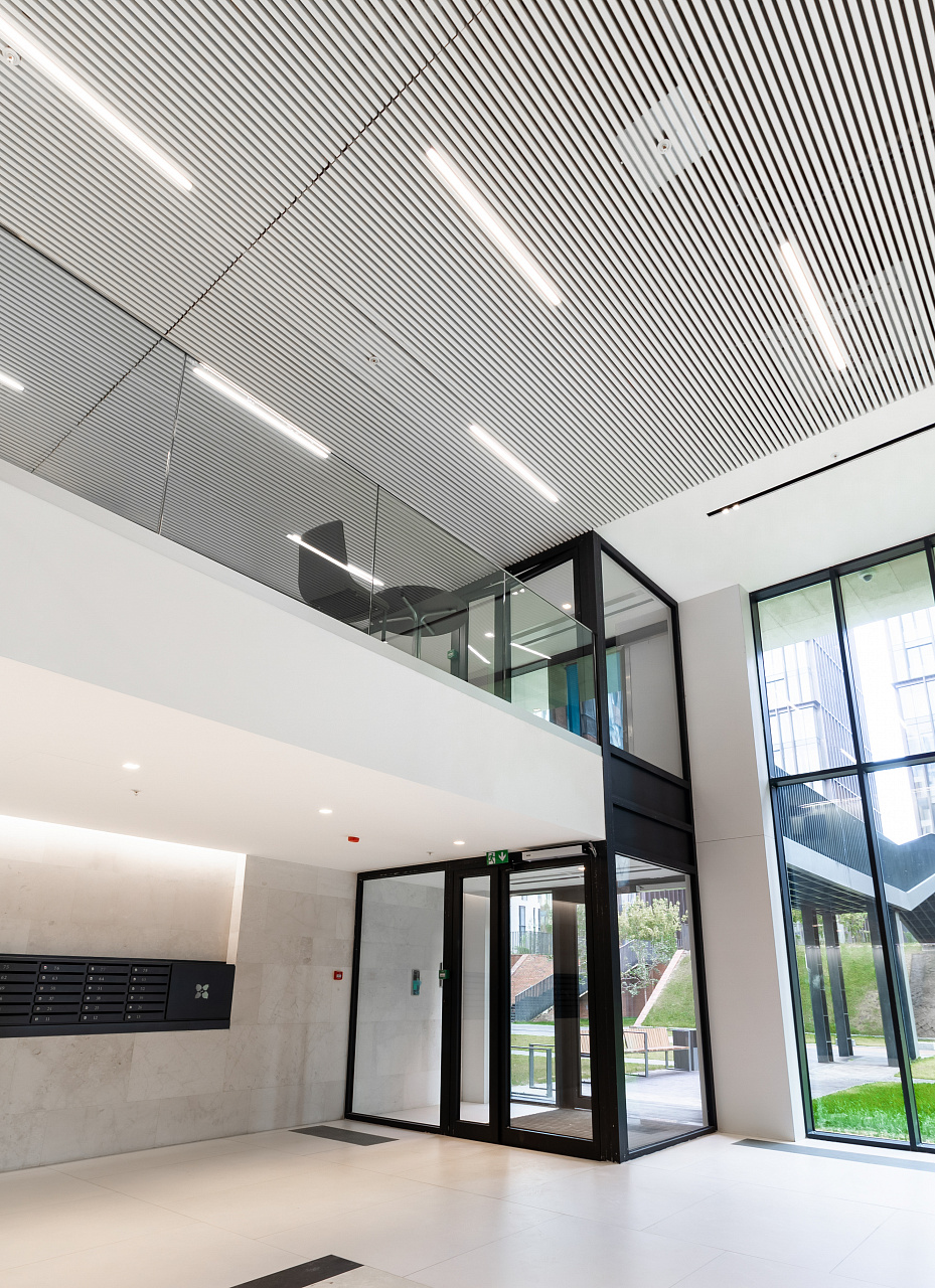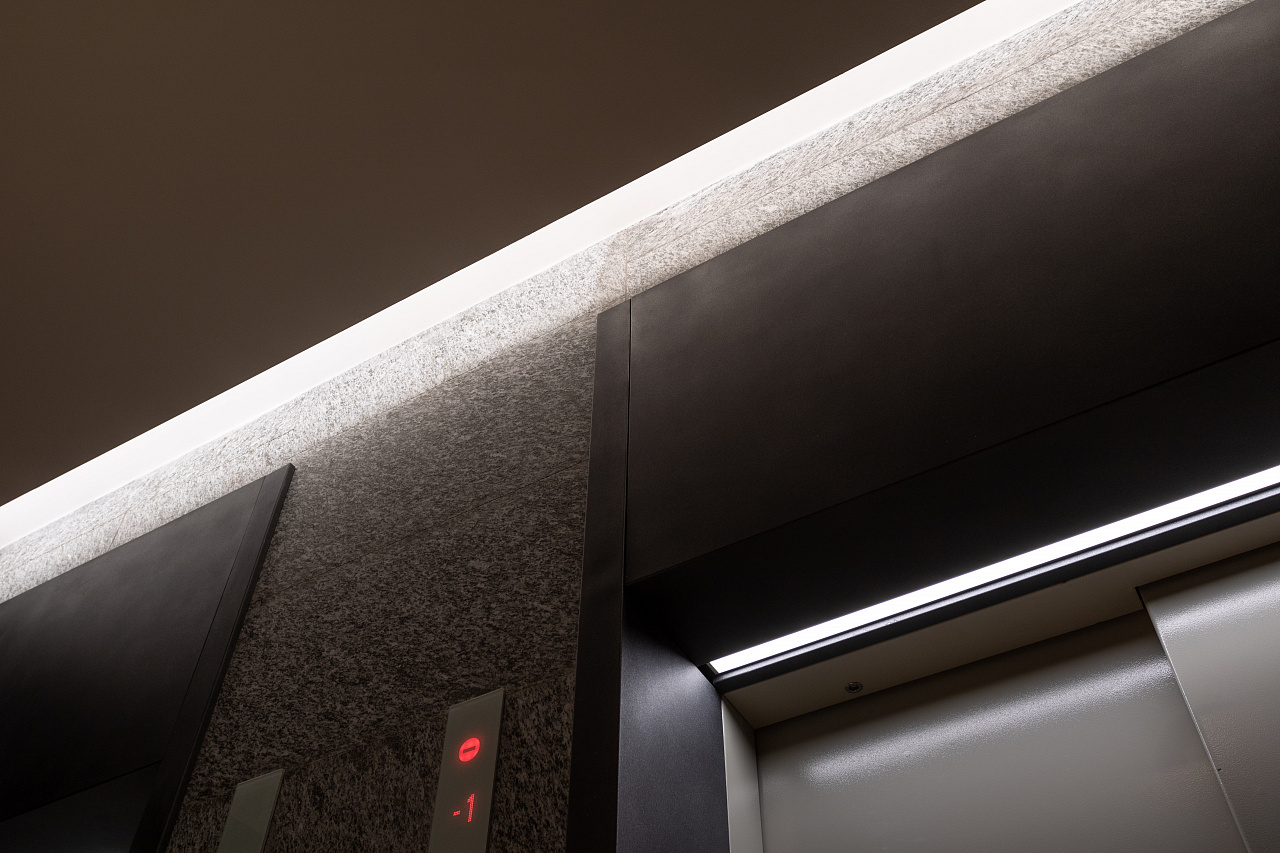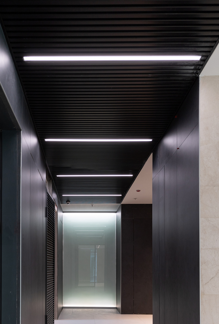 In the common areas of the Garden Quarters Residential Complex, LED equipment is used for both main light and decorative illumination. Multiple light lines, created on the basis of aluminum profile and LED strip, perfectly match the minimalist interior of the halls. The light lines are integrated into the slatted ceiling, and to contrast with them suspended profile luminaires in black housing are used.