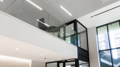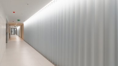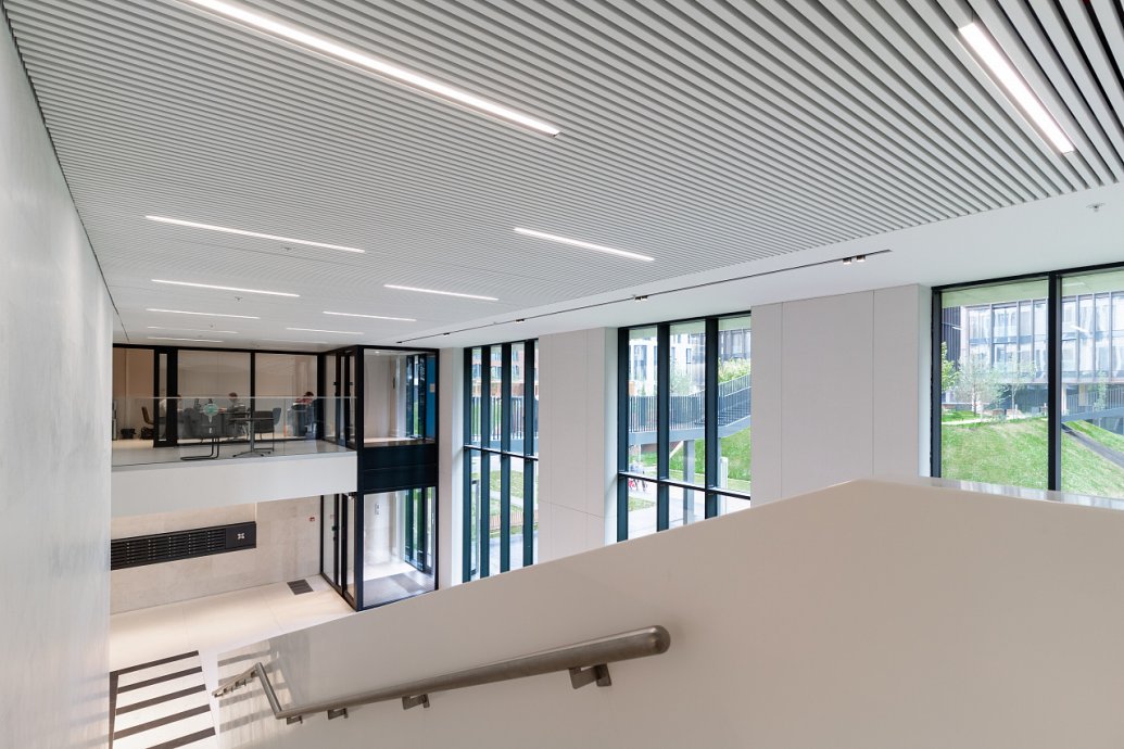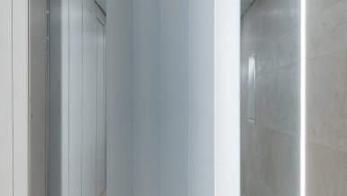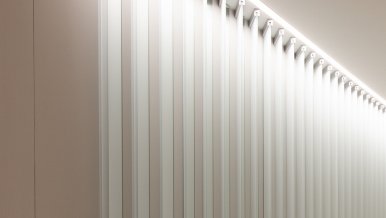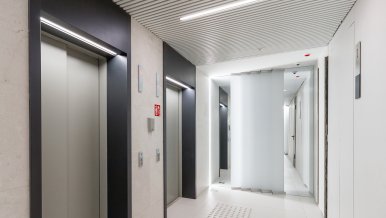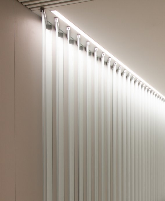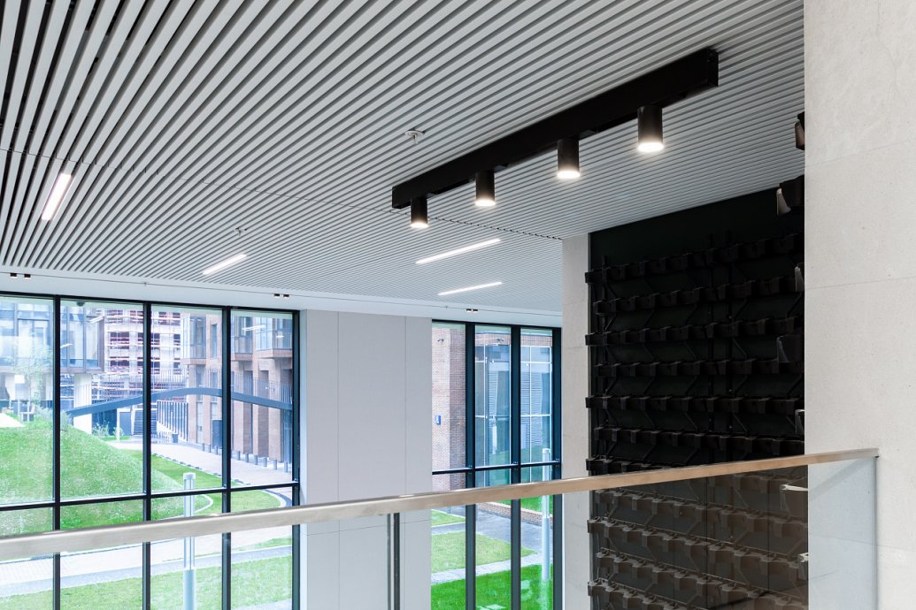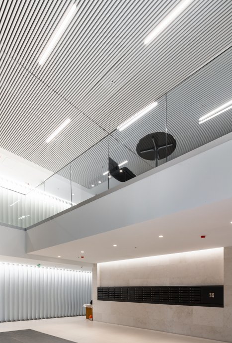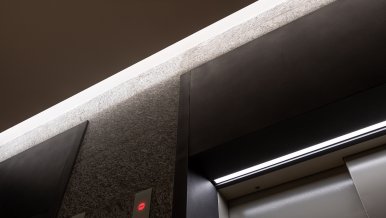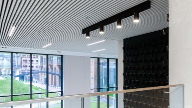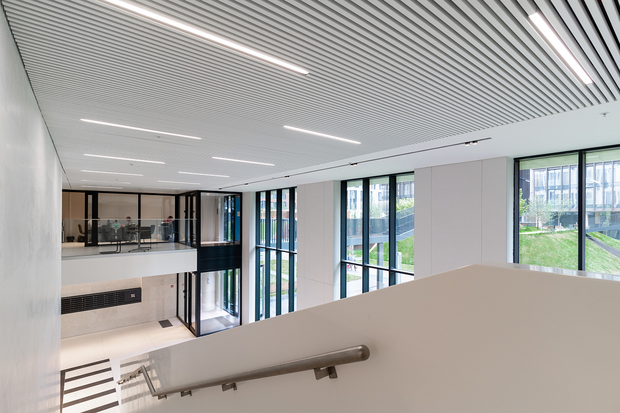 In the common areas of the Garden Quarters Residential Complex, LED equipment is used for both main light and decorative illumination. Multiple light lines, created on the basis of aluminum profile and LED strip, perfectly match the minimalist interior of the halls. The light lines are integrated into the slatted ceiling, and to contrast with them suspended profile luminaires in black housing are used.
