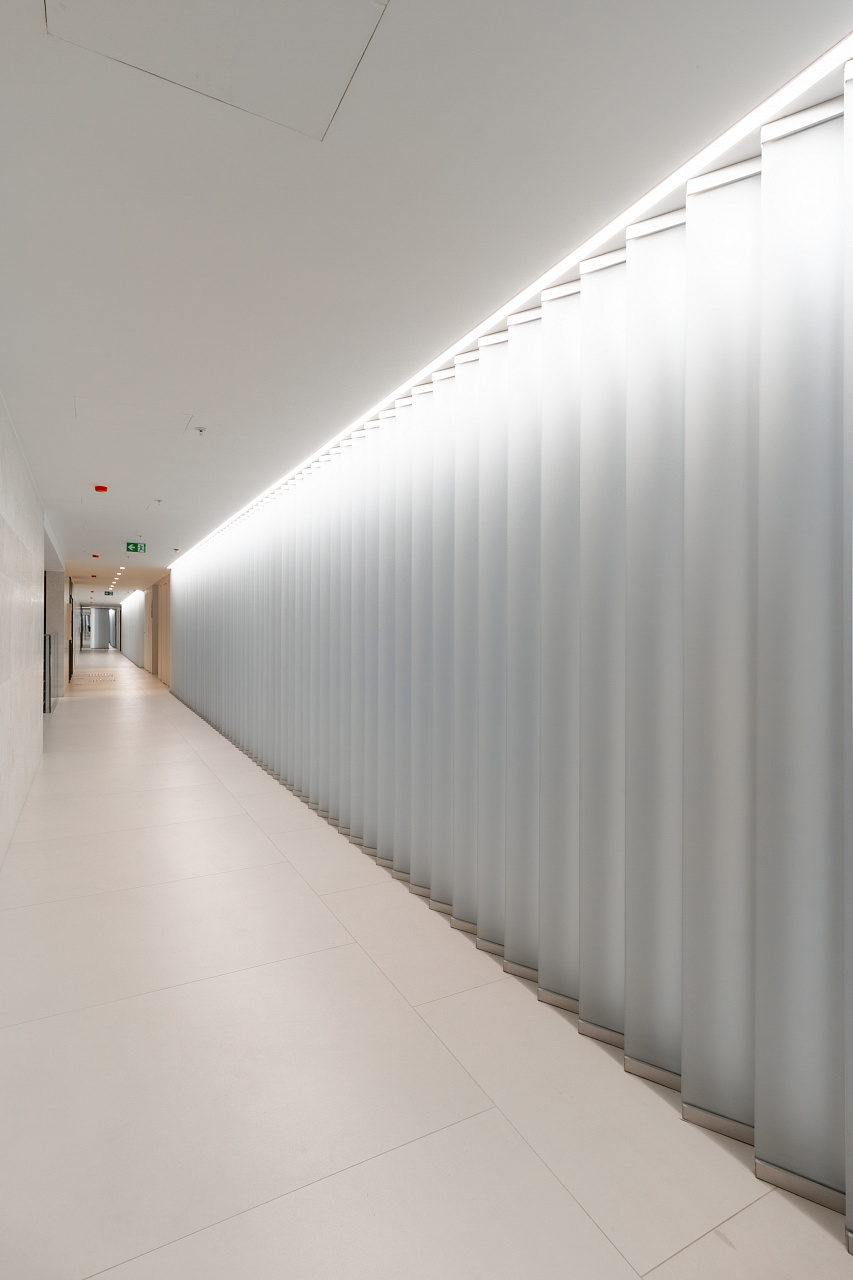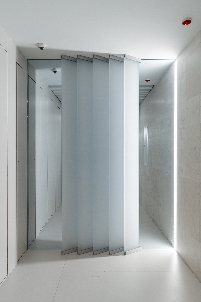 But still the basis of the lighting project are the lines of light evenly distributed throughout the object. They create the effect of sun rays coming in from the street. The atmosphere of a sunny day reigns in the corridors and halls of the residential complex, also due to a well-chosen combination of light sources of cold and warm shades of light.