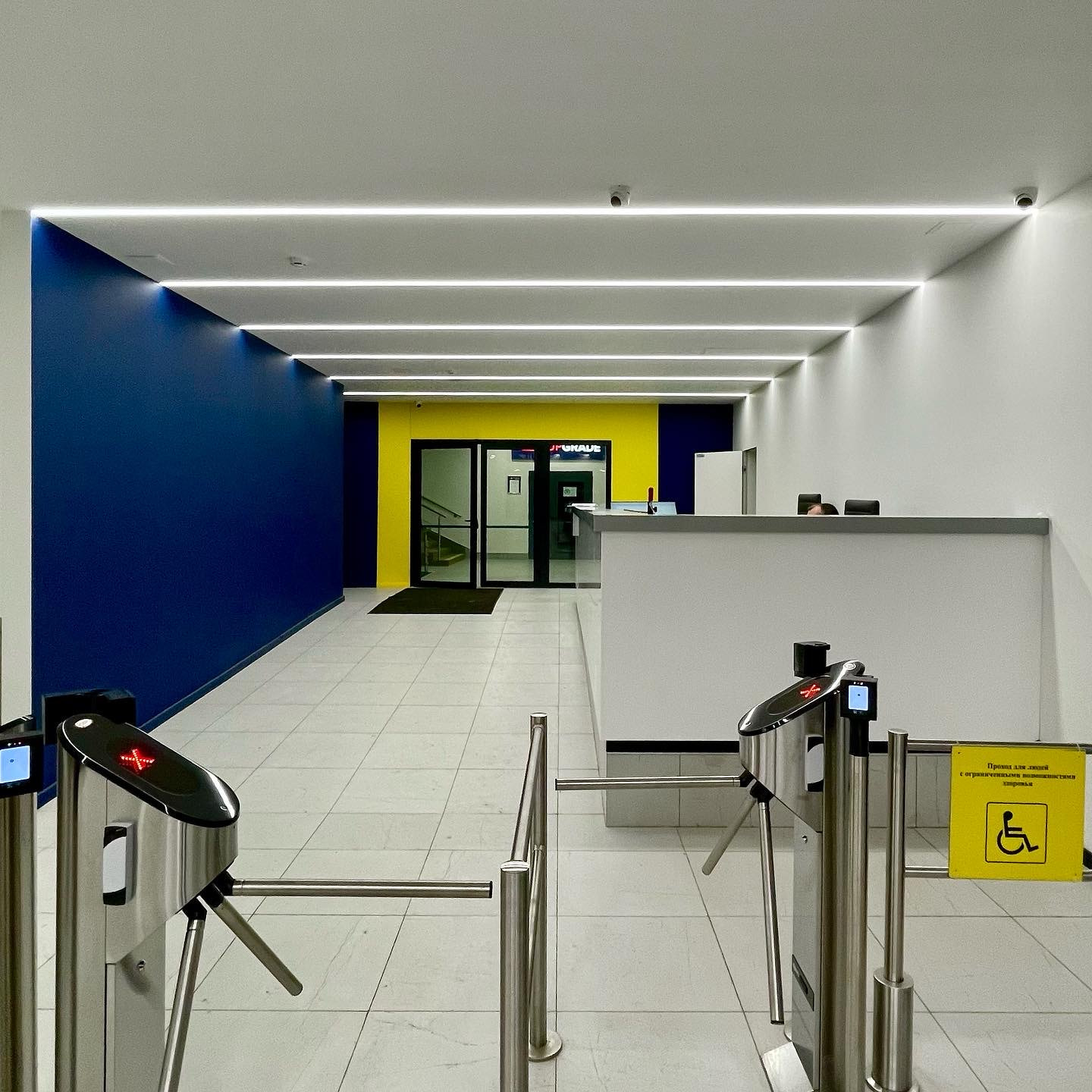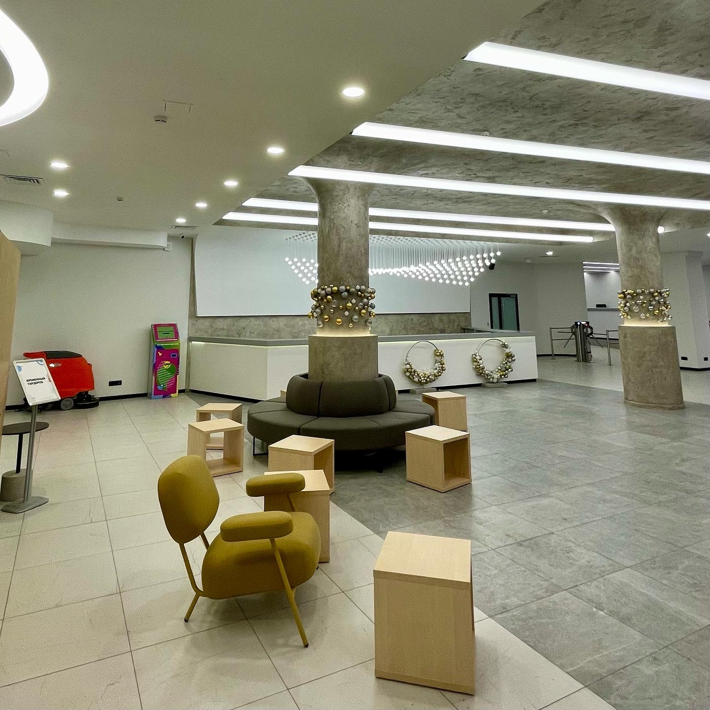 The chute and walls of the hall are decorated with wide light strips, which somewhere pass from one surface to another, and somewhere hang in the air.