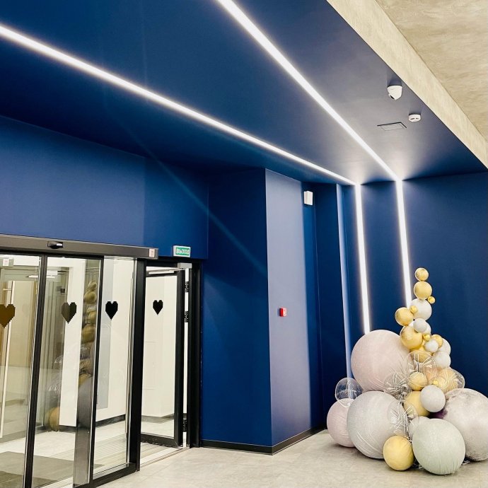 For the lines of light used LED strips of continuous illumination, which allowed to create a continuous uniform luminescence over the entire surface. Due to the high light efficiency of the light flux from the tapes creates sufficient illumination. Daytime white shade of light 4 000 K - a universal option for creating an active mood and cheerful mood.