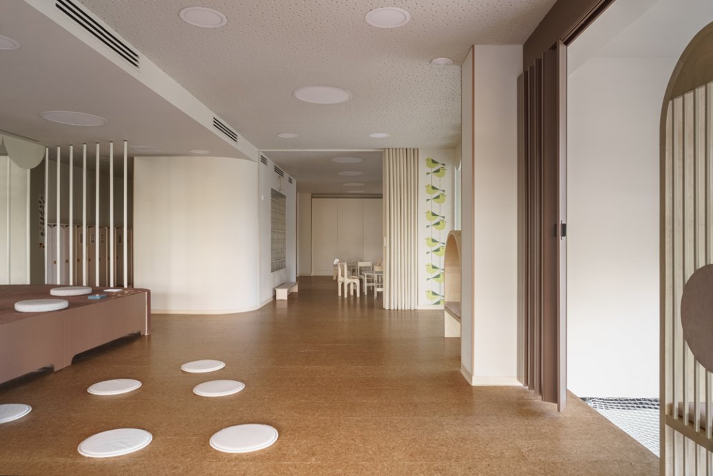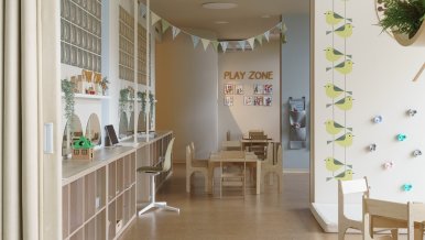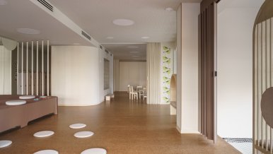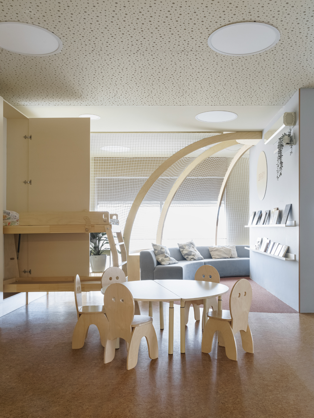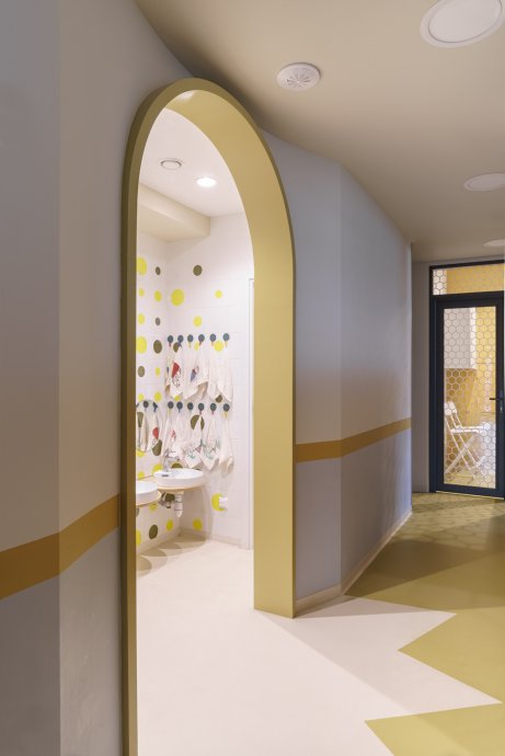 The interior of the kindergarten “Ovsyanki” is created with the orientation on child psychology and emotional component. The design is based on round, soft shapes. They are repeated in different elements that rhyme with each other. Bright “peas” on the walls, handmade models of planets of the solar system, rounded contours of furniture and mirrors, as well as natural light-brown color scheme, plenty of greenery and natural wood furniture - all this creates a comfortable atmosphere enveloping with coziness and joy. Such a pleasant environment helps to harmonize the psycho-emotional state of children.