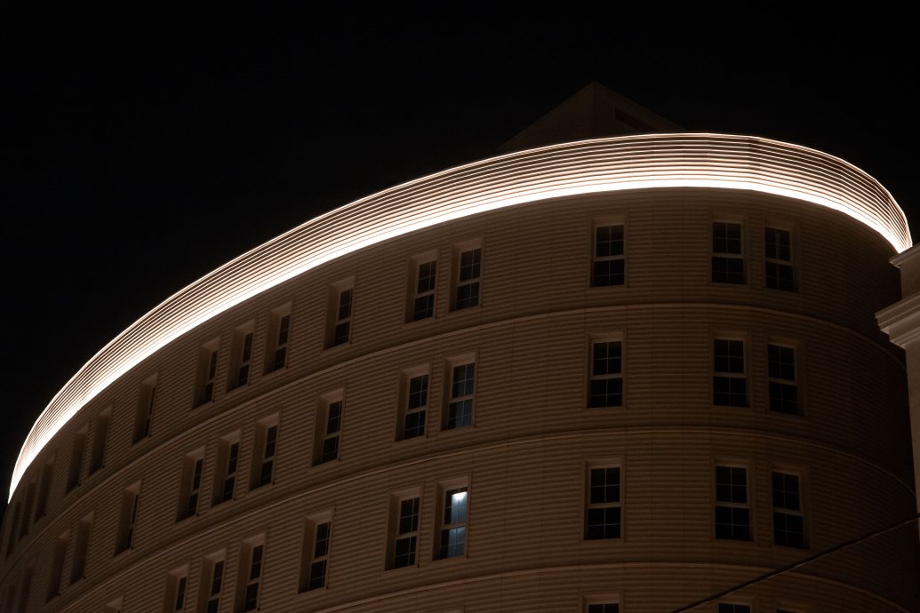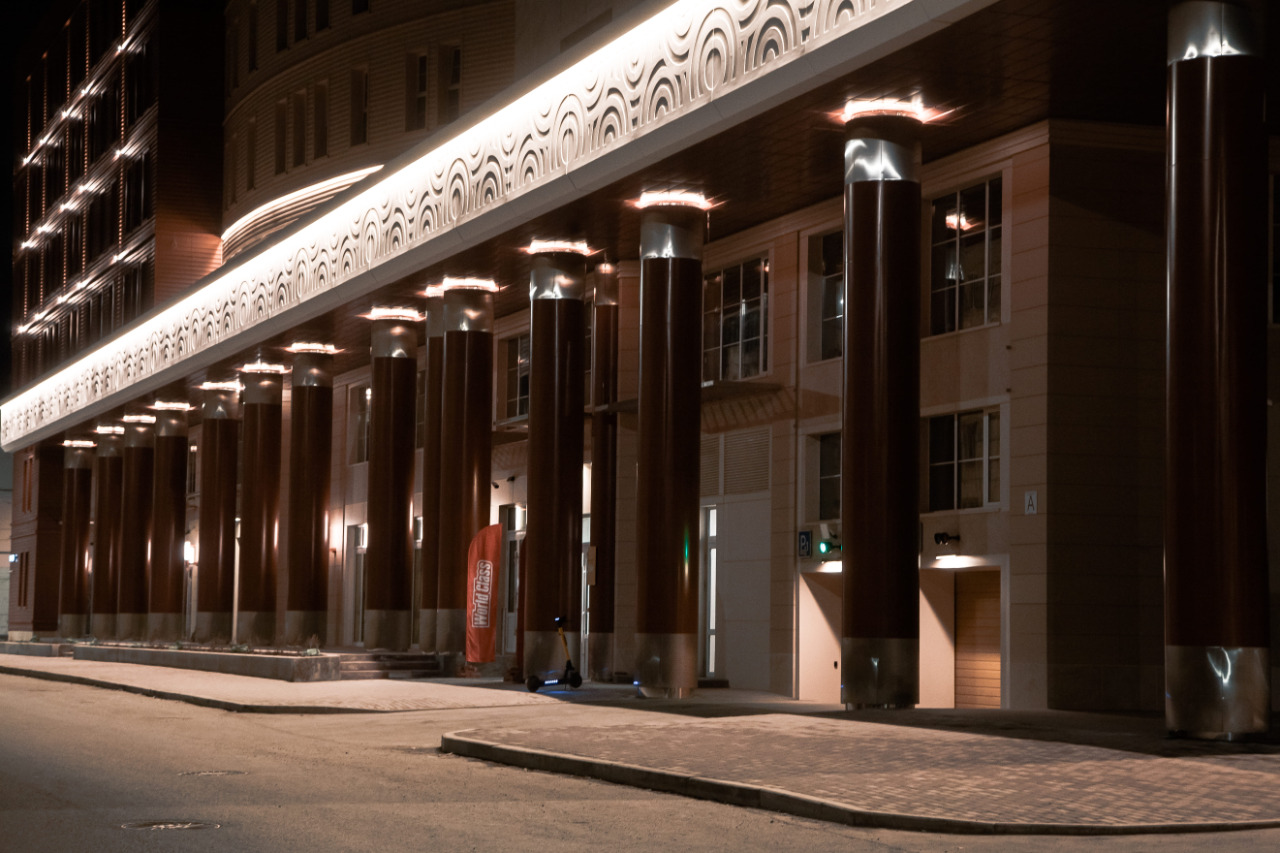 Particular expressiveness of the complex of buildings at night is given by the backlighting, made on the basis of sealed tape ARL PV C72. Warm shade of luminescence (3 000 K) creates a cozy atmosphere, harmoniously emphasizes the classical elements of decor, gives additional volume to relief surfaces. On one of the buildings, the illumination is organized along the upper and lower contours in wide strips that emphasize the monumentality and premium nature of the building.