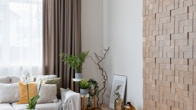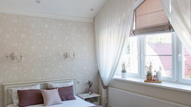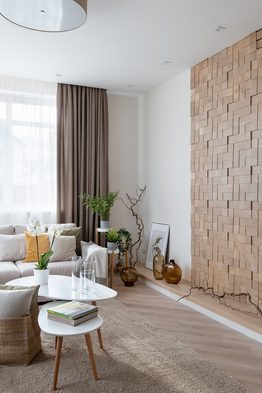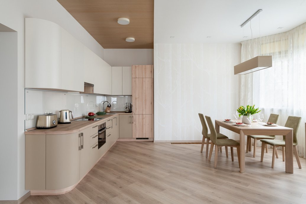 In the living room, built-in ceiling lights are decorated with a glass frame. In the kitchen area the role of the main lighting is performed by round surface-mounted luminaires with a body imitating wood. Also in the kitchen is implemented illumination of the working area on the basis of aluminum profile and LED tape.