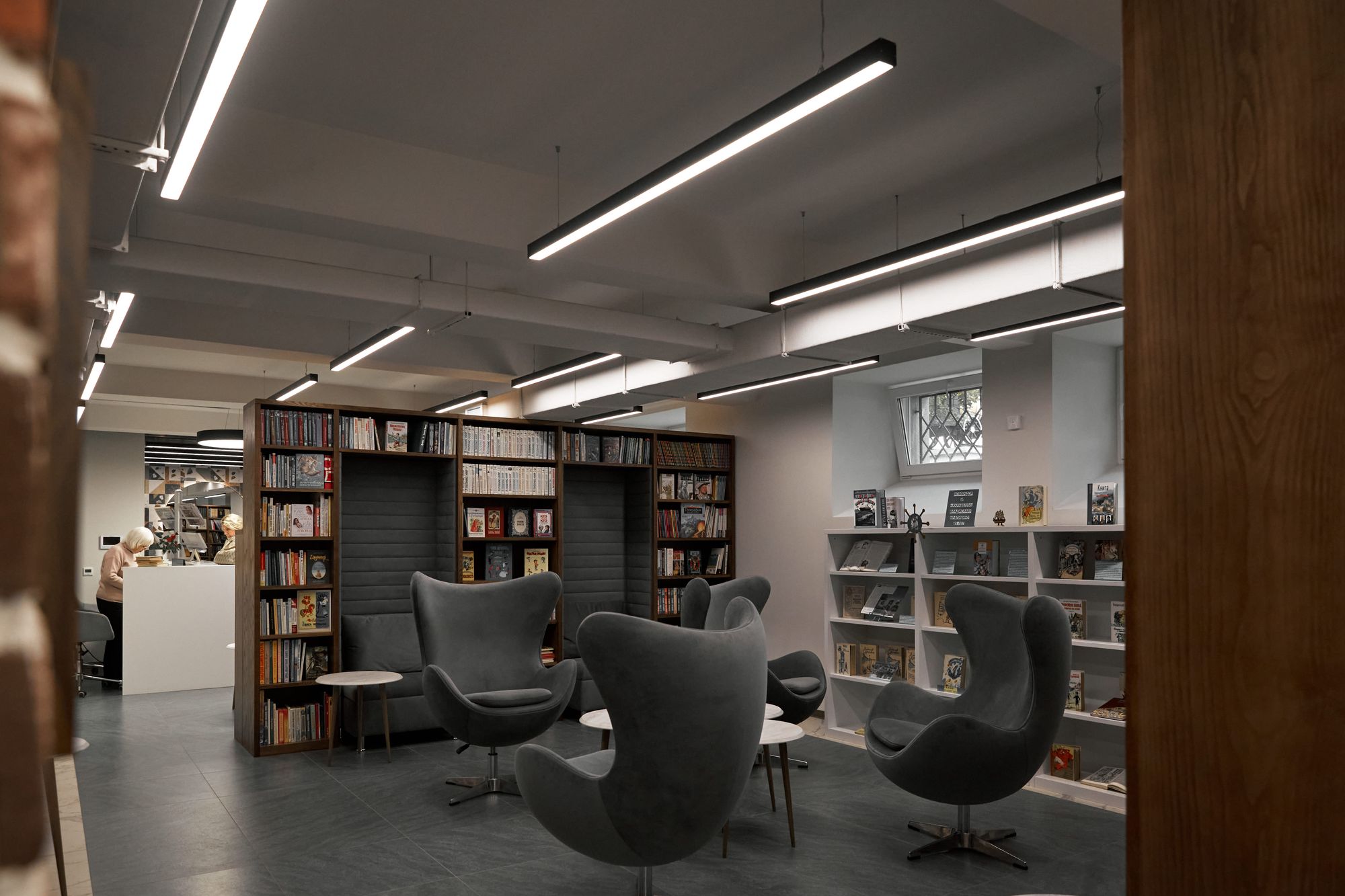 In the library, suspended luminaires based on LED strips and SL LINE profiles balance the ceiling slabs. In a stylish black color, they create a clear geometry. TOR PILL PRISM round luminaires bring playful motifs into the interior, bringing back the idea that the space is organized for children.