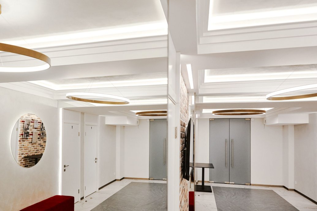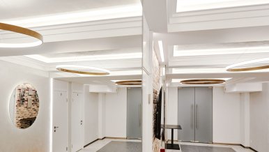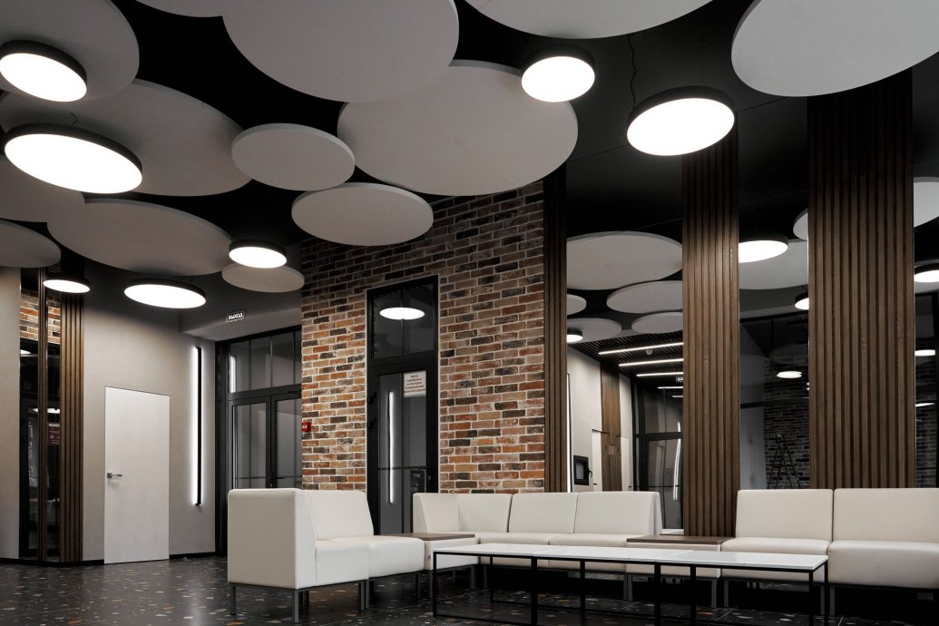 In the lobby of the children's center, white luminaires of different sizes RONDO rhyme with round decorative panels on the ceiling, creating a light, relaxed atmosphere so suitable for children's spaces. Thanks to the opal screen, which softly diffuses the light, a comfortable glow is created.