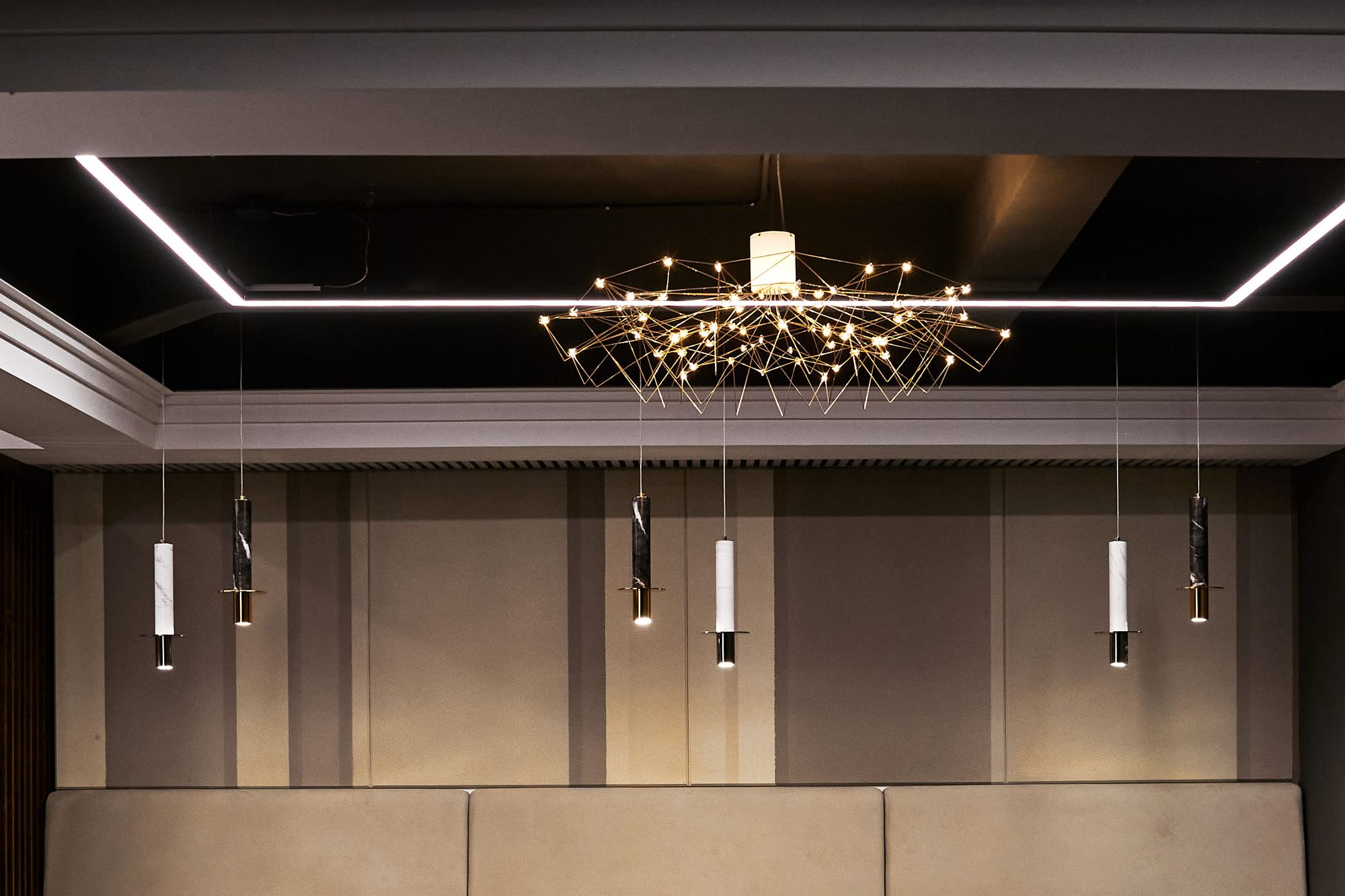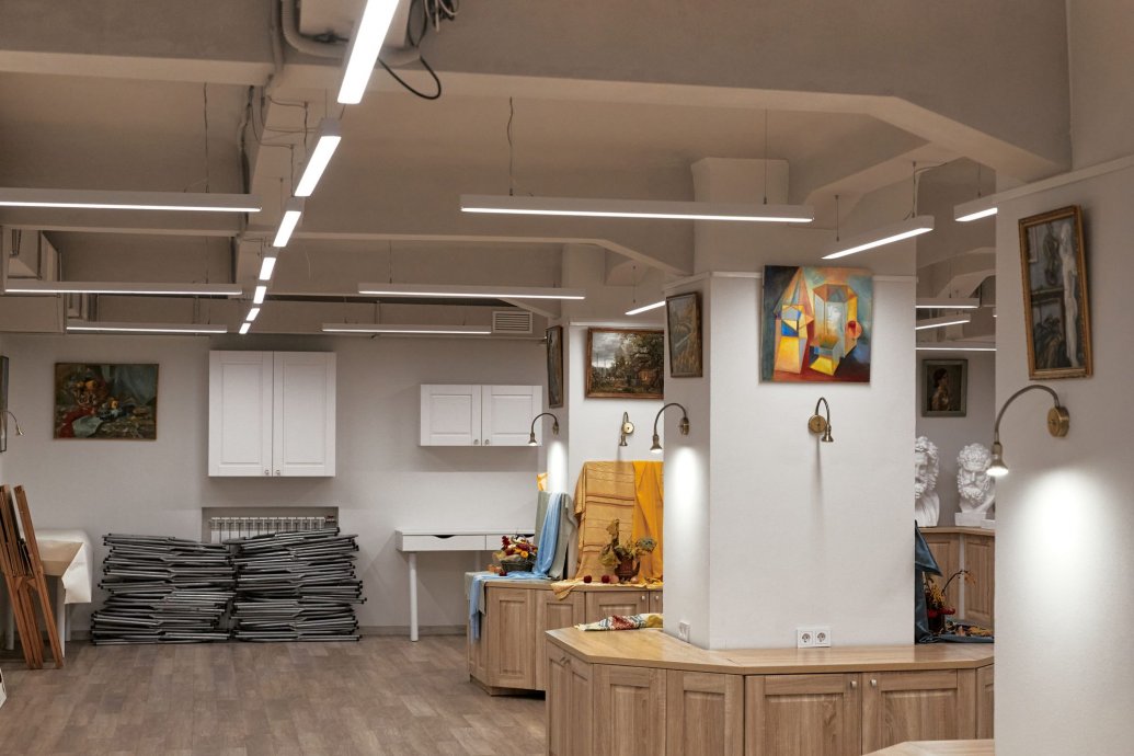 In the folk studio of fine arts named after Y. K. Kiselev the same linear pendant lights are used, but in white color. They seem to continue the theme of overlapping ceilings, but thanks to the white color do not overload the interior.