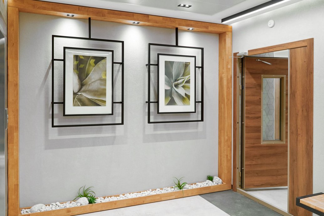 Paintings placed on each floor of the complex create an aesthetic image of the premises. CL SIMRLE luminaires are used for accent lighting of the paintings. Thanks to the gimbal swivel mechanism and the narrow angle of the light flux, the light can be directed precisely at the object, emphasizing it in the general space. The luminaires have a high color rendering index (CRI>90): colors in such a light space are displayed as naturally as possible.