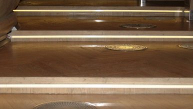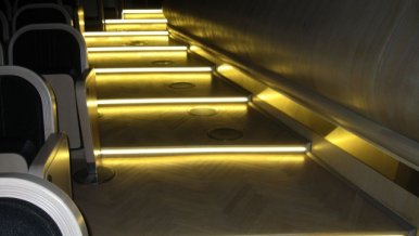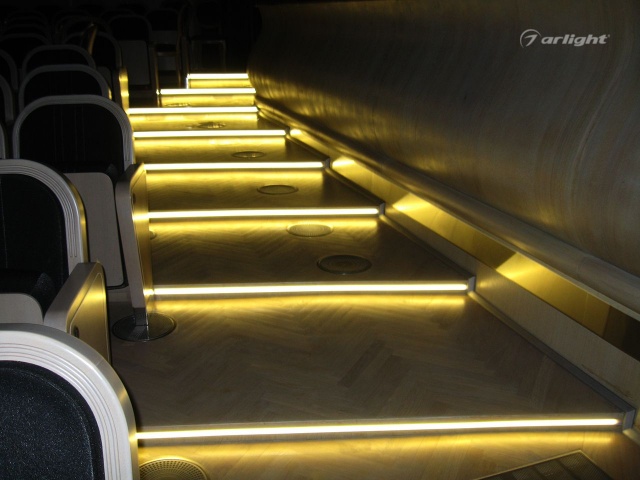 In the theater hall, in addition to the basic lighting in the classic style, it was decided to add LED lighting of the stairs. This solution harmonized with the interior, while increasing the safety of the auditorium.