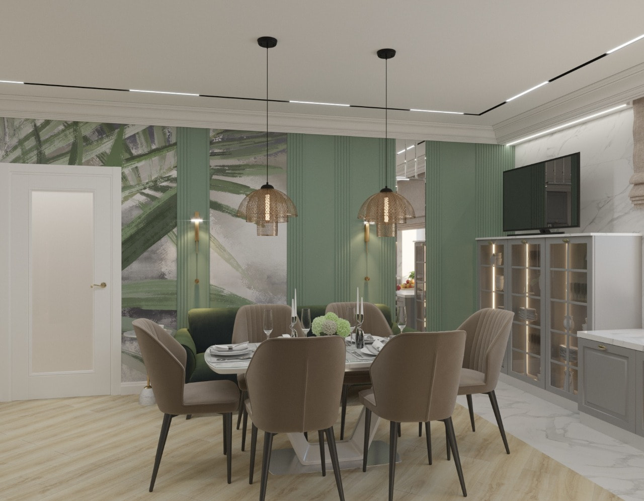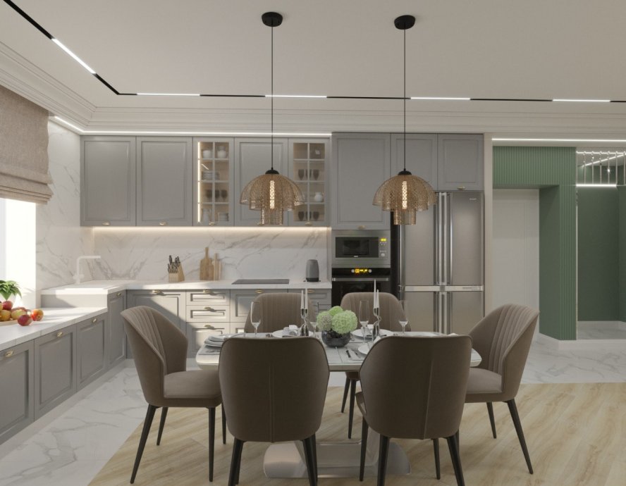 Along the perimeter of the kitchen is a graceful line of illumination, which outlines the ceiling, creating an additional volume, visually increasing the height of the room.