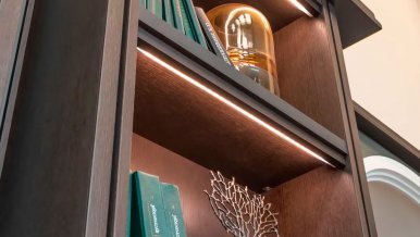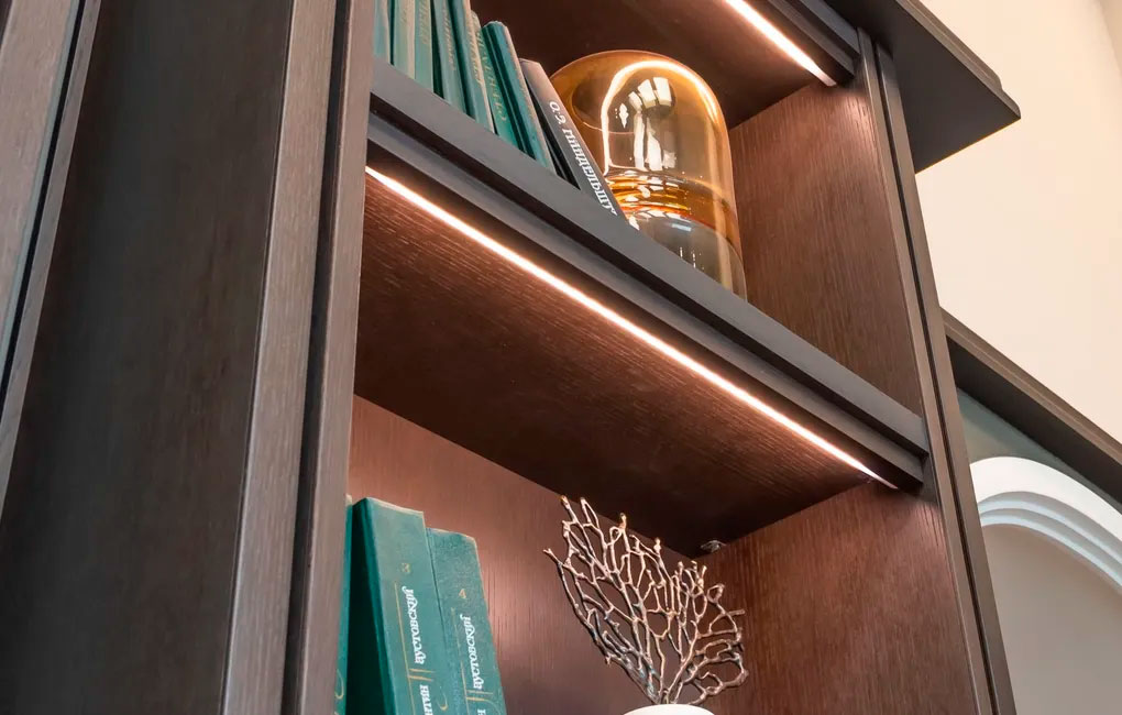 A special cozy home atmosphere is given to the lobby by cabinets and shelves with warm backlighting, created with the help of LED tape series RT with a color temperature of 3 000 K, aluminum strip and frosted diffusion screen F-KA. Control of such backlighting - on, off, smoothly changing the brightness of light - is possible with the help of dimmers for monochrome LED tape series SMART, working in conjunction with both wall panels and remote controls.
