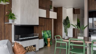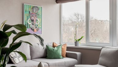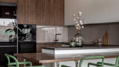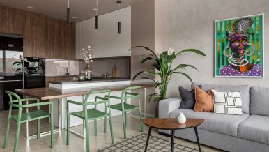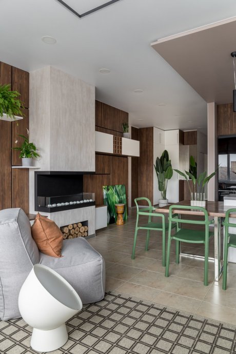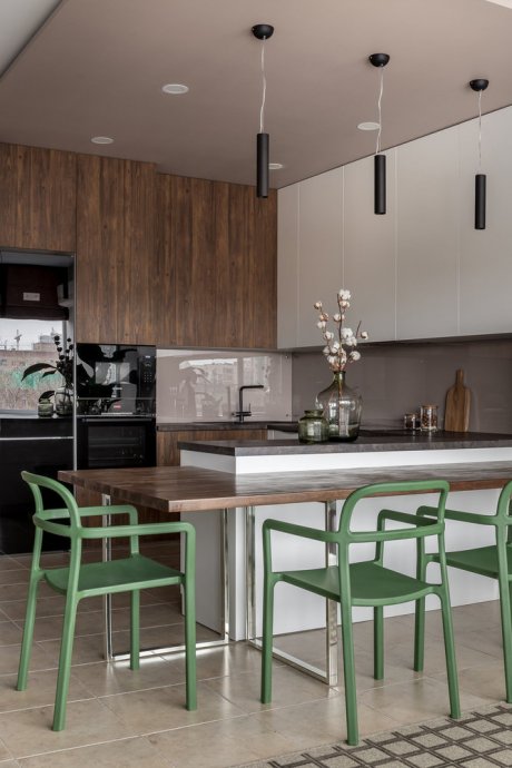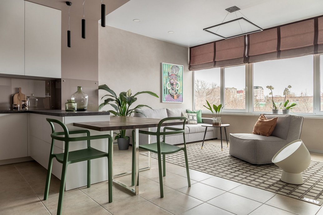 The space of the studio apartment is filled with lightness, light and air. Calm natural shades, lots of greenery and natural light. Artificial lighting does not play a major role in the project. In addition to a pair of laconic pendant lights, the main lighting is provided by built-in flat LED panels, which almost merge with the white ceiling, and above the kitchen area harmonize with the facades of furniture.