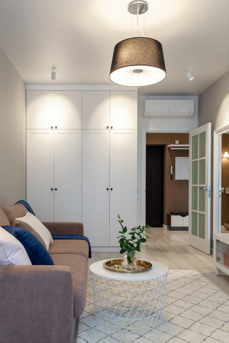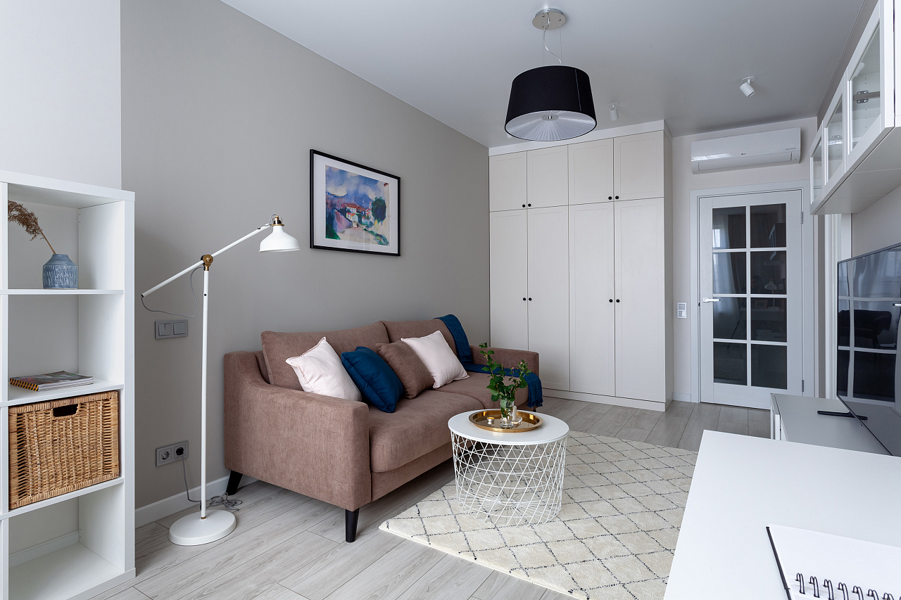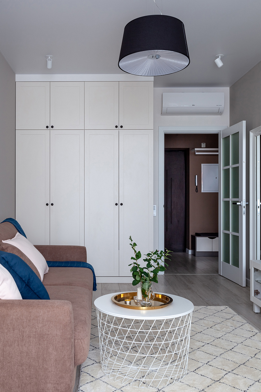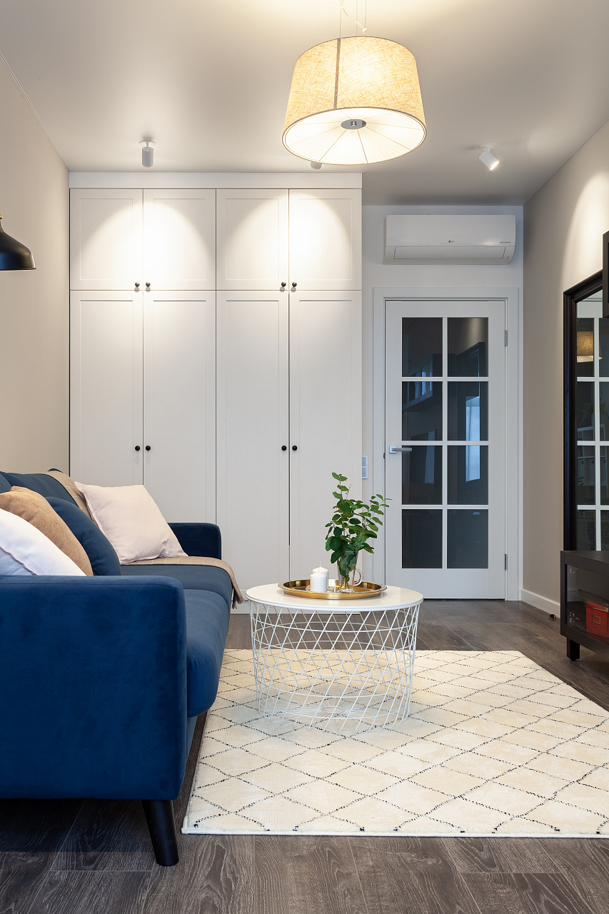 The interiors of the two apartments differ only in their color scheme. Lighting of both interiors is also arranged according to the same scheme. For the cozy living space, we have chosen lamps with warm white color of glow.