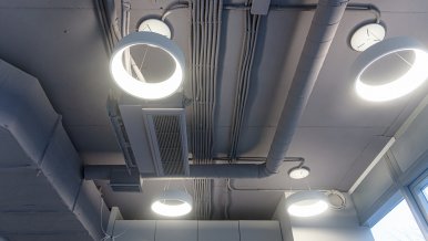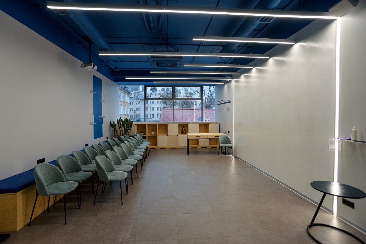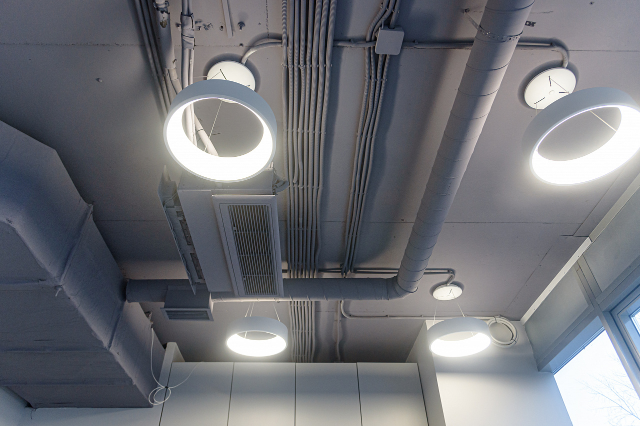 Selected LED strips of daylight white color have a high color rendering index CRI>90 and in combination with matte screens perfectly cope with the function of the main lighting.