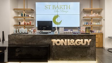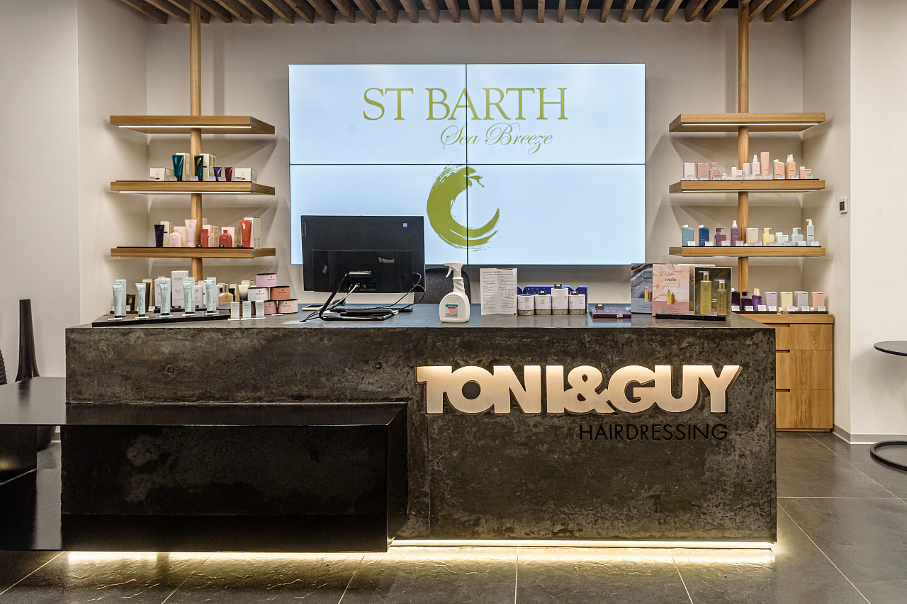In the Toni&Guy beauty salon, the designers gave lighting a special role. In the main hall, light lines of various widths are installed both in the glossy black ceiling and in rows of wooden slats. Geometric light pattern stands out brightly against the background of the dark interior, reflected in the gloss and creates interesting visual effects.