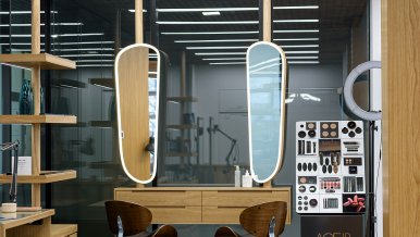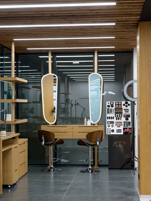 To illuminate other areas of the salon are used ring-shaped luminaires with internal light, suspended linear luminaires, round surface-mounted luminaires - in accordance with the interior features and purpose of the area.