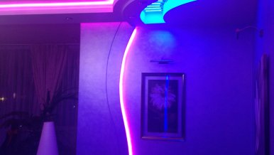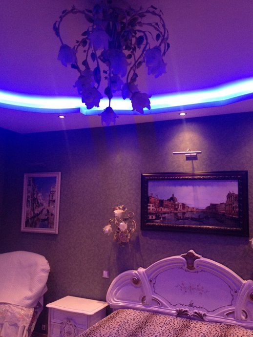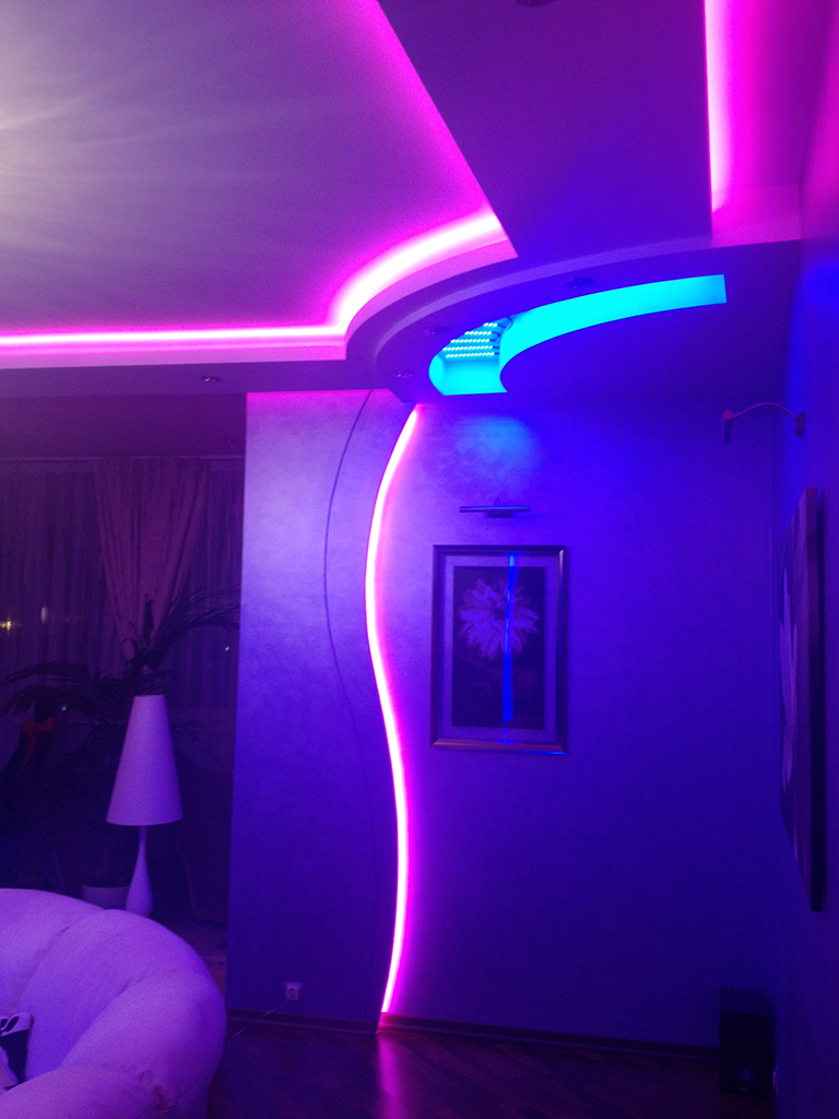 Controllers and power supplies for ribbons are hidden in the interior space of the niches of multi-level ceilings, so do not create visual noise in the interior.