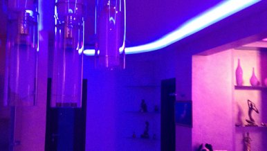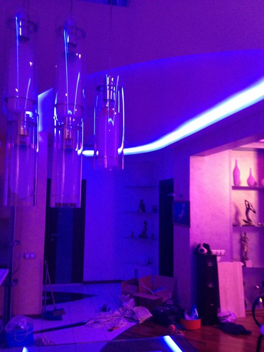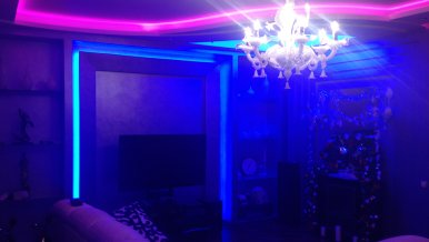 RGB LED strip from Arlight was used for decorative lighting in the apartment. The tape with a density of LEDs was installed in ceiling and wall niches. All three-dimensional decorative forms were decorated with light with the ability to choose any shade of glow.