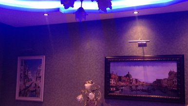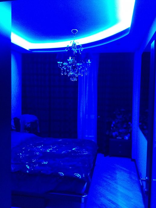 The apartment owners have solved the issue of lighting control as follows. The lighting in each room is controlled by a separate remote control. At the same time in the living room and bathroom are used multi-zone remote controls that allow you to control several lighting zones independently of each other. This solution creates variability in lighting control and different scenarios. Selecting the brightness of illumination, the color of the tape, turning on and off the light source in different zones is available thanks to RGB controllers for controlling multicolor LED strips.