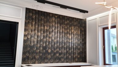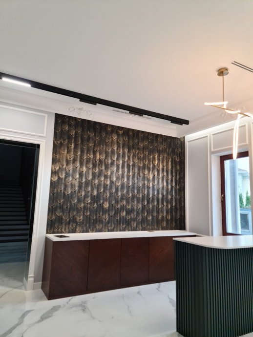 In the hallway, important challenges were addressed. The low ceiling and the lack of possibility to hide the wires behind the ceiling led to non-standard solutions. Firstly, profile luminaires on pendants were used. Secondly, a 12-meter-long supply cable was installed inside the linear luminaire housing. For this purpose, an H-shaped profile was chosen to accommodate all communications.