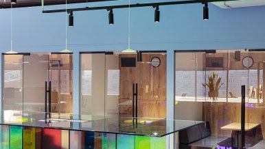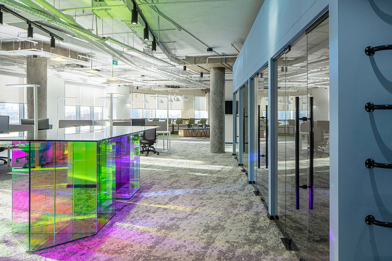 The main lighting in the office is numerous track systems. Tracks are a popular solution with flexible lighting control. The ZEUS luminaires used in the project rotate around their axis and have a variable angle of the light beam, making it easy to change the direction of light. It is also possible to adjust the light level in a particular area by moving the luminaires along the track. 4TR track systems allow you to group luminaires and control each group separately. Placing on the same track luminaires of warm and daylight shades of luminescence, grouping them by color temperature, you can in one movement create the desired atmosphere in the room: invigorating or relaxing.