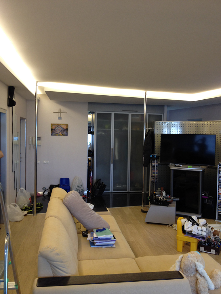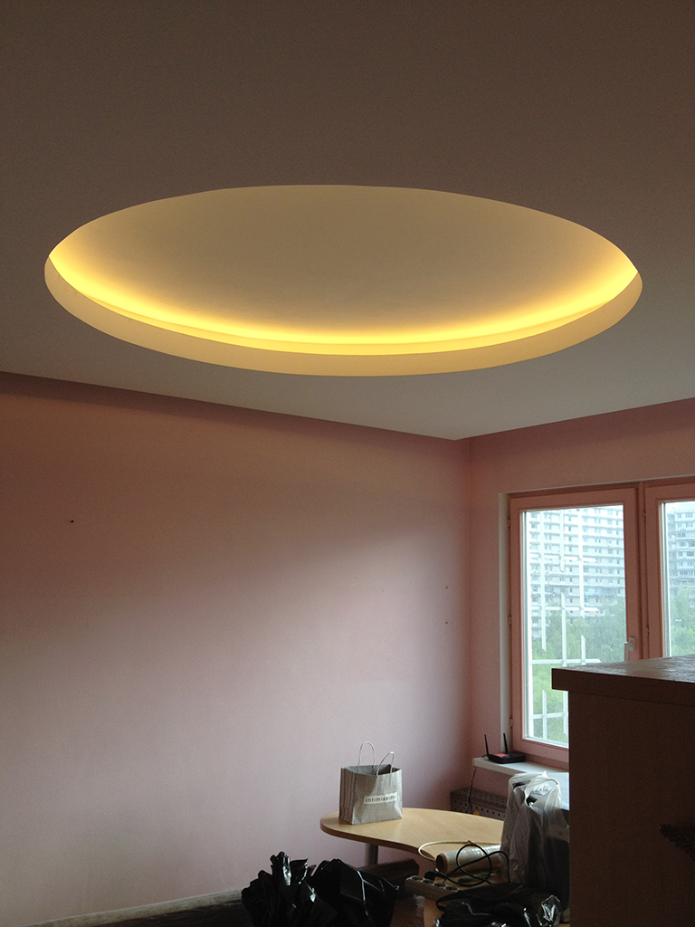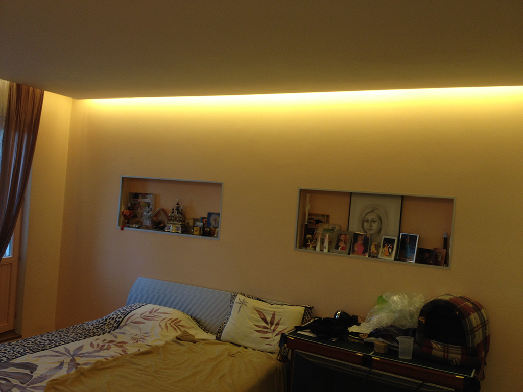 During the first renovation in this apartment as a source of decorative lighting used fluorescent lamps, because LED strips at that time just appeared on the market, were not widespread and cost quite expensive.