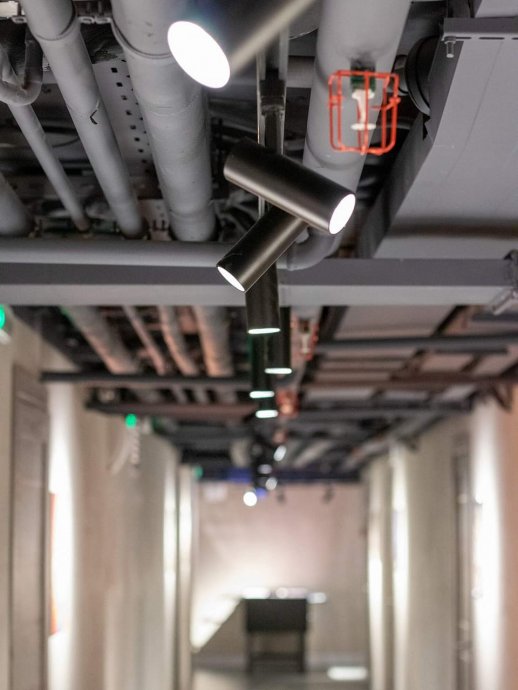 Thanks to the simple and laconic design of the luminaires, they fit perfectly into different locations of the space. Luminaires with a cylindrical body visually echo the pipes of communications on the ceiling, which it was decided to leave open.