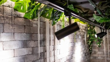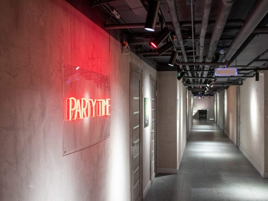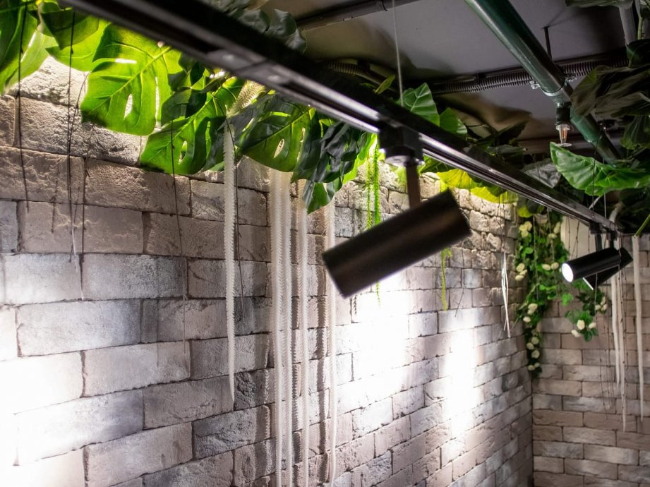 A popular solution - track lighting fixtures - was used to illuminate the creative space Party time, designed in loft style with bright accents. Black tracks practically merge with the ceiling without attracting unnecessary attention. Their task is to give high-quality accent light and complement the interior, not to single lead. High-quality light space is provided by high color rendering index of GERA luminaires. This is important, as the luminaires in many locations are used to illuminate colored art objects.