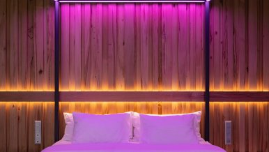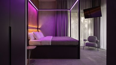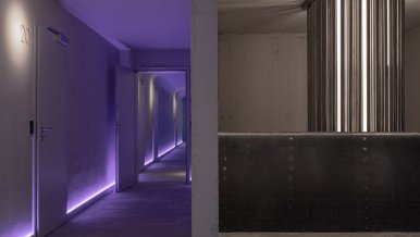 Corridors are filled with intense violet light, which immerses into an unreal world. For easy navigation, guest rooms are illuminated with ZEUS track lights for accent lighting.