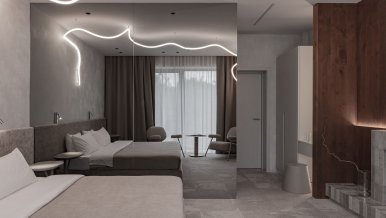 Each hotel room is dedicated to one of the seven water elements. The interior of each room is themed accordingly. In some rooms, it is the lighting that plays a key role in creating the atmosphere. Guests can choose a calm design in the rooms “Fog”, “Snow”, “Stil” or more extravagant. For example, the rooms “Typhoon” are decorated with RGB LED tape in a bold purple-orange color scheme, creating a sense of impending storm at the end of the day. And in the rooms “Thunderstorm” illusion of sparkling lightning creates a flexible neon, stretched across the entire space.