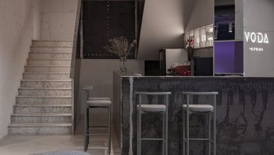 On the territory of the thermal complex with the same name there is a cozy boutique hotel VODA. The architectural solution of the building is gently integrated into the surrounding natural space. The dark gray horizontal masonry facade paired with vertical panels looks neat and restrained, allowing nature to remain in the foreground. The reflection of the trees in the large panoramic windows creates an illusion of interconnection between the interior and exterior spaces.