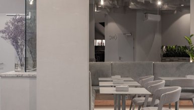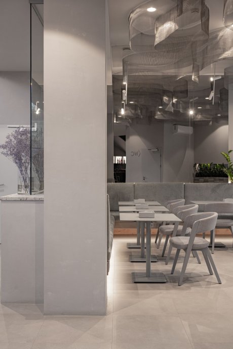 The interior of the cafe, designed in a moderate gray scale, draws attention to the ceiling. Here, with the help of an installation of transparent mesh fabric and accent light, the illusion of floating morning fog is created.