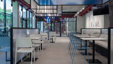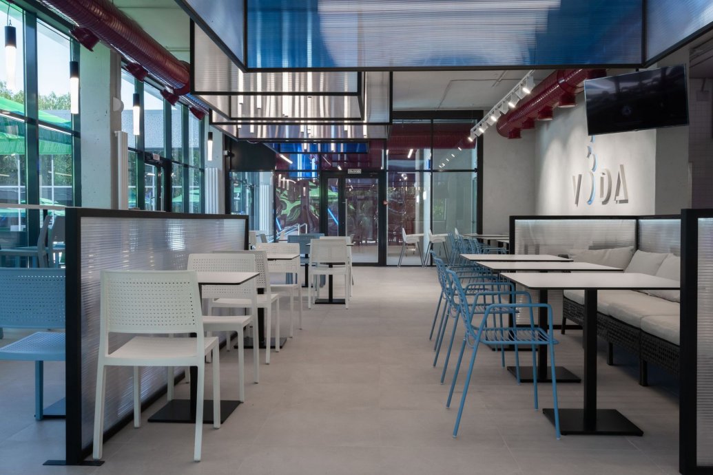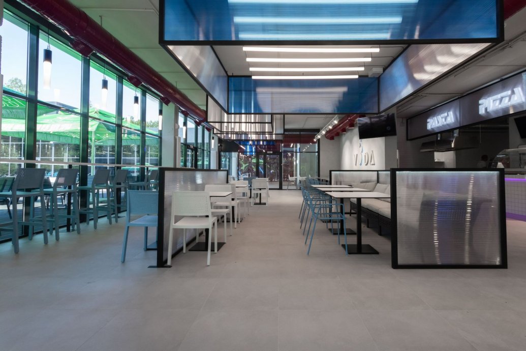 For the main lighting in the corridors of the thermae and cafe, linear luminaires based on profile and LED strip were used. In the cafe area, local lighting is organized with the help of original tube luminaires with vertical orientation. To create them used round profile and LED strip with the highest color rendering index (CRI>95). In such a light space, the colors look especially pure and bright, which is in line with the overall concept.