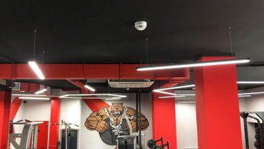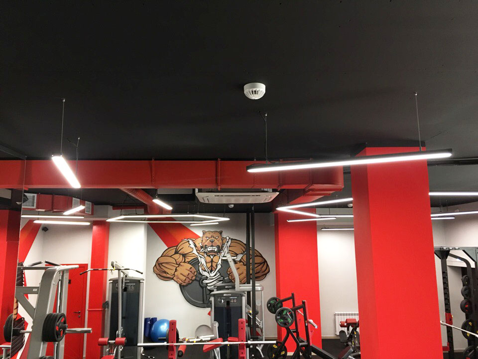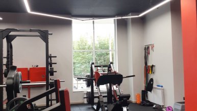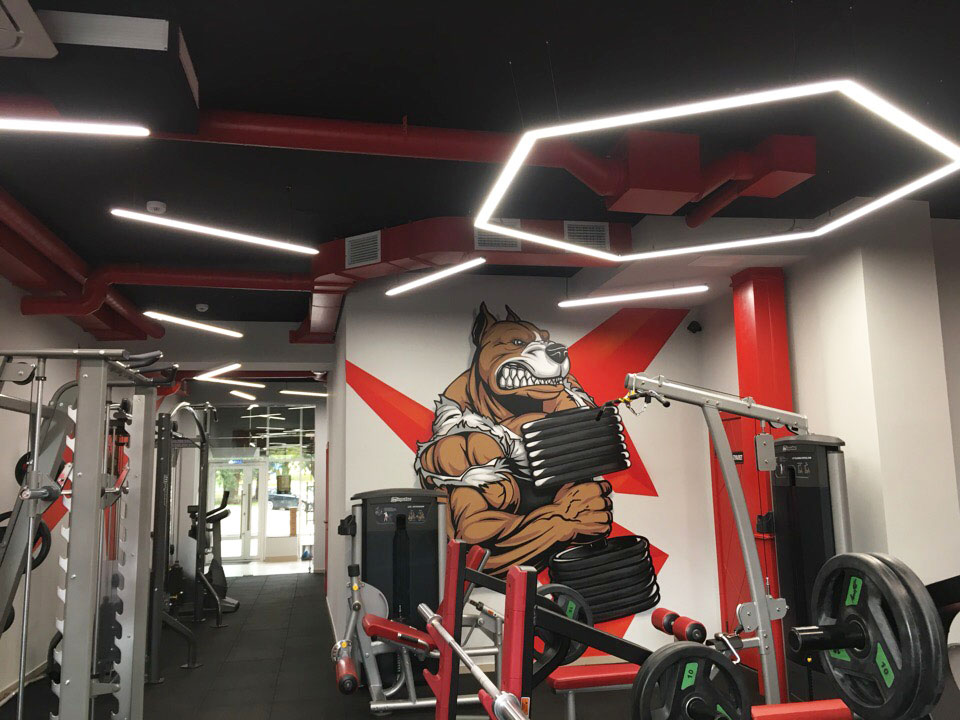 Profile luminaires are used as the main lighting sources in the gym. Interesting geometric shapes give the room boldness and set the mood for active training. The highest color rendering index (CRI>95) of the tape mounted in the luminaires creates a comfortable light space and promotes high performance. At the same time the matte screen softly disperses light, avoids the effect of blinding.