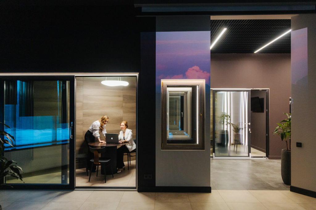 The interior of the window showroom in Izhevsk is based on strict geometry, as if repeating the laconic geometry of the offered products, and is designed to focus visitors on the choice.