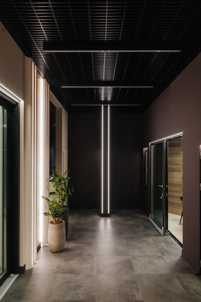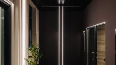 Light lines based on MICROLED and RT-A120 series LED strips and profiles with screens are clearly and harmoniously integrated into the interior. Suspended linear luminaires on the ceiling serve as the main source of illumination and become an integral part of the decorative ceiling composition. Vertical light lines from floor to ceiling emphasize the decorative texture of the walls, visually increase the height of the ceilings and give lightness to the space.