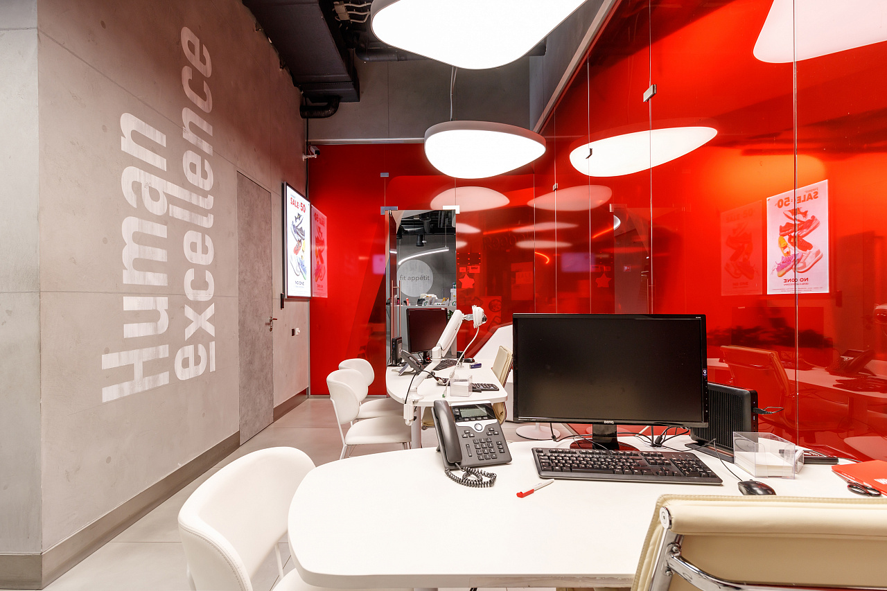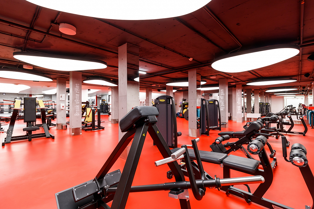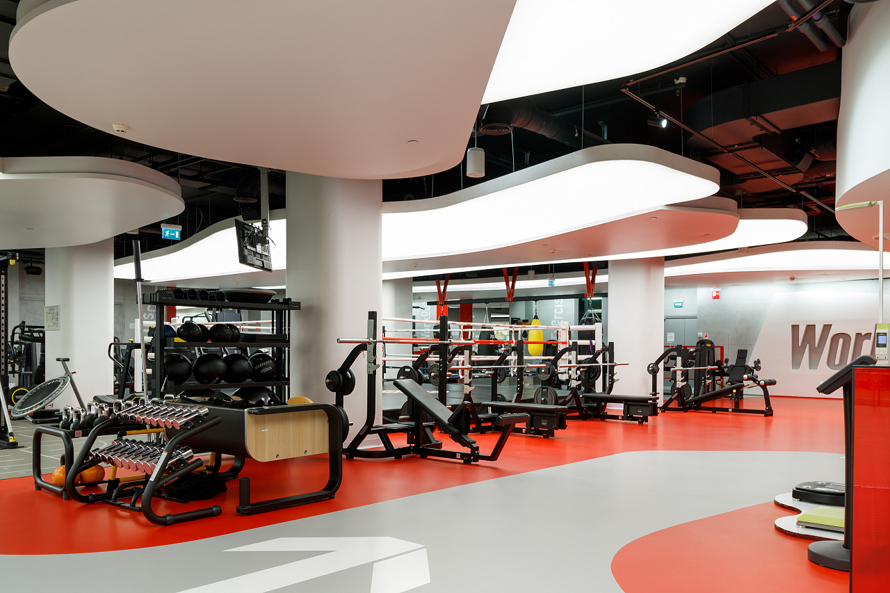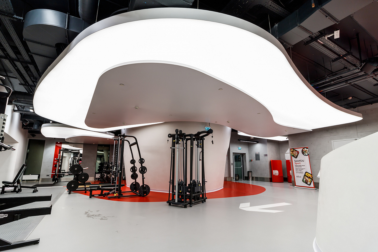The main “trick” of lighting in World Class fitness clubs is the already recognizable curvilinear luminaires emitting soft uniform white light. The scale of these structures can be different depending on the room. If in the office area they are small neat flat lights, then in the gyms they are large format or even whole luminous canvases that gently wrap around the space and fill it with a pleasant diffused light.