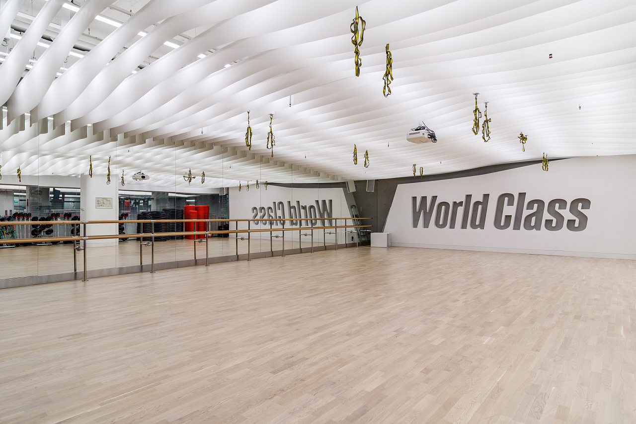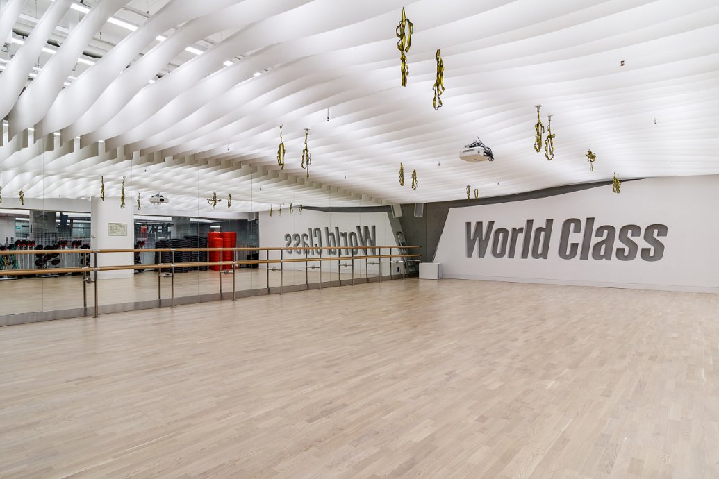 In the hall for group classes also uses LED lighting, but here it is already rows of suspended linear lights, the light from which passes through the decorative structure, made in the form of light white waves, adding airiness and spaciousness.