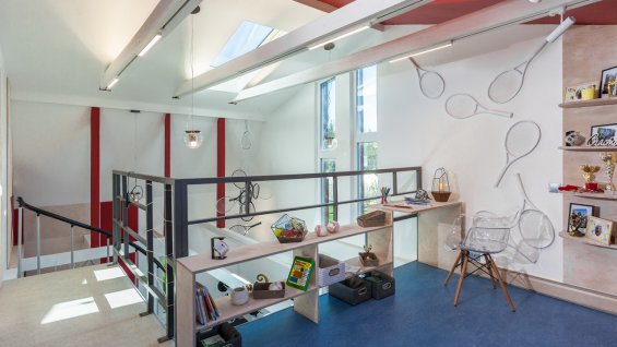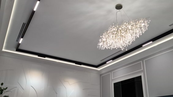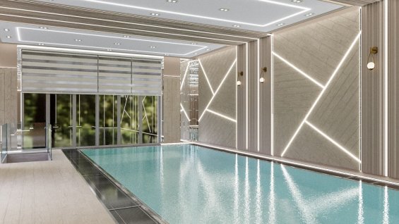 The spacious pool area in the country house required a large amount of light. The task was accomplished with multiple spotlights and light lines placed on the ceiling, walls and floor.