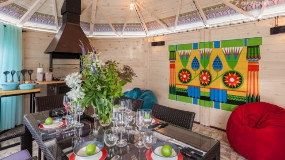 Plasterboard construction of complex geometric shape in conjunction with LED lighting became a bright and eye-catching element of the interior in the country house.