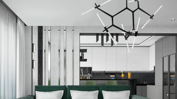 An elite apartment in an apartment building is committed to a monochrome palette, which gives it a cozy and practical space for five family members. The combination of noble shades of gray, white and beige creates an interior that does not tire, even in spacious rooms.