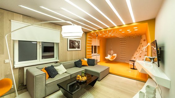 In this design project, thin lines of light are placed along the edge of the cornice, which visually increases the height of the ceiling and creates a sense of space between the ceiling fabric and the cornice.
