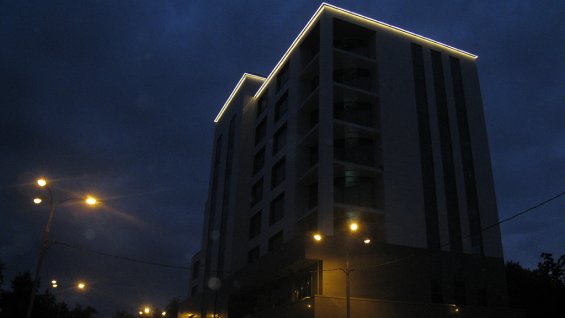 Organization of facade lighting of the building in Moscow.