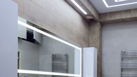 The modern, laconic interior in the minimalist style is made in strict gray-beige cold shades. Multiple lines of light based on RT, RTW and UL strips and SL and LINE profiles rhyme with verified simple forms and provide sufficient illumination.