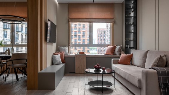 The depth of the living space is created by a contrasting combination of colors and textures: complex velvet blue, sand-wood. Matte white and gray served as a base.